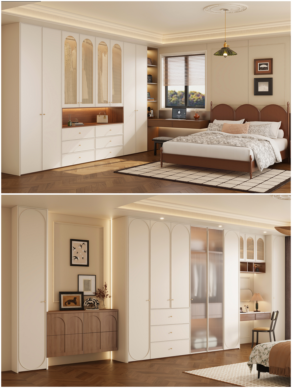 衣櫃采用(yong)懸浮設(shè)計(ji),離地輕盈通(tong)透,穿插牀(chuang)頭櫃,設(shè)計(ji)感十足✨