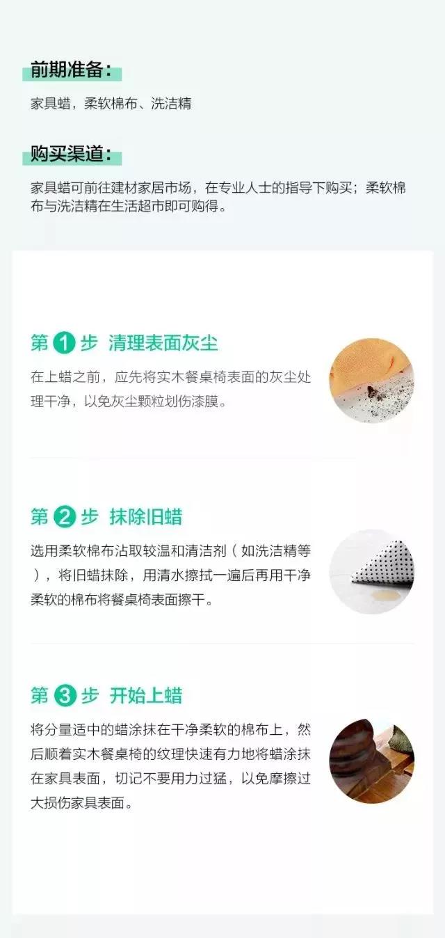實木(mù)餐桌椅很(hěn)容易沾上油污、墨迹等(deng)污漬,可(kě)以(yi)使用(yong)以(yi)下清(qing)潔小(xiǎo)妙招: