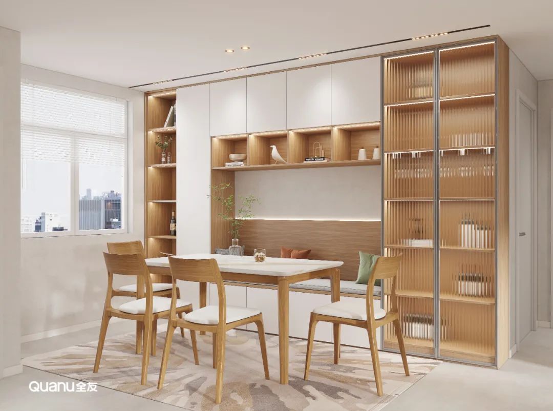 設(shè)計(ji)師在(zai)餐廳定製(zhi)整牆餐邊櫃,中(zhong)間留出空間做了(le)卡座代(dai)替餐椅,不僅設(shè)計(ji)感十足,還節(jie)約出了(le)一(yi)邊餐椅占據的(de)過(guo)道空間。