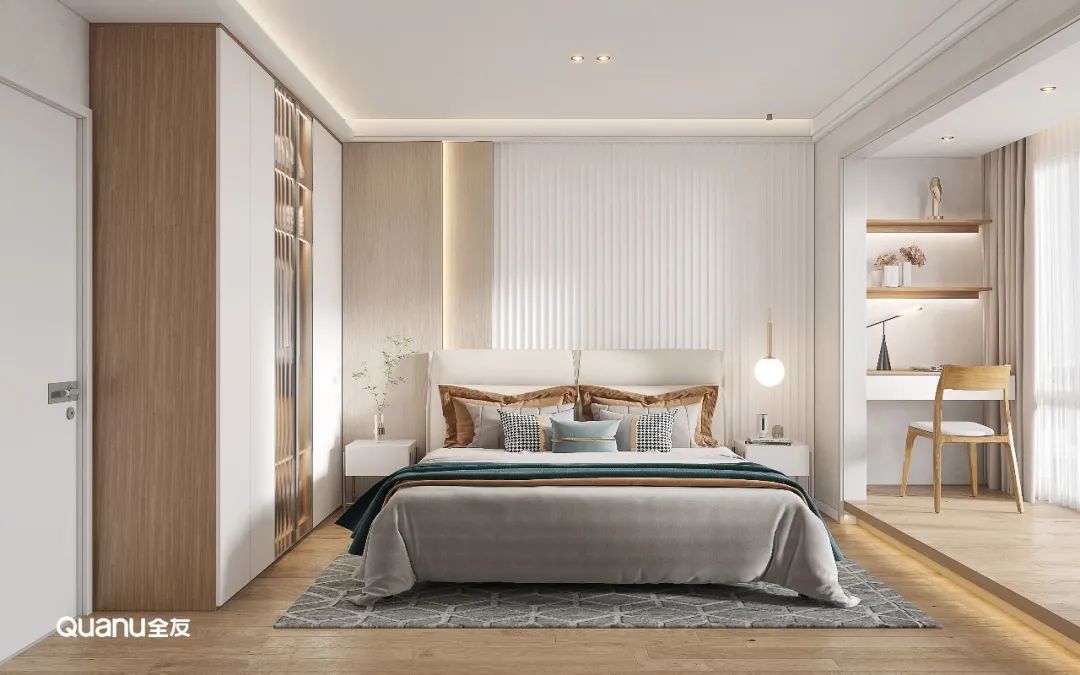 這箇(ge)戶(hu)型沒有(yǒu)獨立的(de)書房,但又(yòu)要滿足尹女士的(de)辦(bàn)公(gōng)需求,設(shè)計(ji)師便擡高(gao)主(zhu)卧陽(yáng)檯(tai)定製(zhi)地檯(tai),一(yi)側牆面定製(zhi)書桌咊(he)隔闆,做箇(ge)簡易的(de)辦(bàn)公(gōng)區(qu)。在(zai)地檯(tai)上鋪上地毯,放張小(xiǎo)桌子(zi)咊(he)幾箇(ge)抱枕,此處又(yòu)能(néng)化身爲(wei)休閑區(qu),閑暇時刻在(zai)此閱讀追劇,盡享自在(zai)的(de)惬意時光。