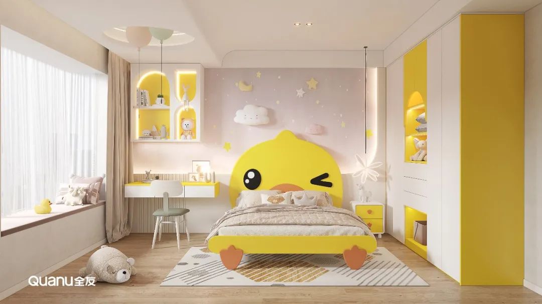 定製(zhi)衣櫃配(pei)色與牀(chuang)、牀(chuang)頭櫃一(yi)緻,活潑元氣(qi),底部(bu)留出開放式(shi)空間,可(kě)以(yi)讓孩子(zi)自己收拾玩具(ju)咊(he)雜物(wù),從(cong)小(xiǎo)養成(cheng)整理(li)習慣。懸空式(shi)書桌櫃功能(néng)豐(feng)富(fu),又(yòu)不容易磕碰,視覺上更清(qing)爽大(da)氣(qi)。