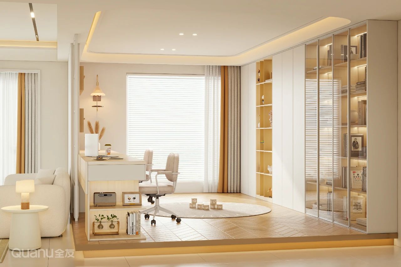 也(ye)可(kě)通(tong)過(guo)地檯(tai)劃分(fēn)區(qu)域(yu)空間,隻需将跼(ju)部(bu)地面擡高(gao)10cm,底部(bu)嵌入隐形燈帶,即可(kě)得到(dao)一(yi)箇(ge)氛圍感滿滿的(de)開放式(shi)書房。