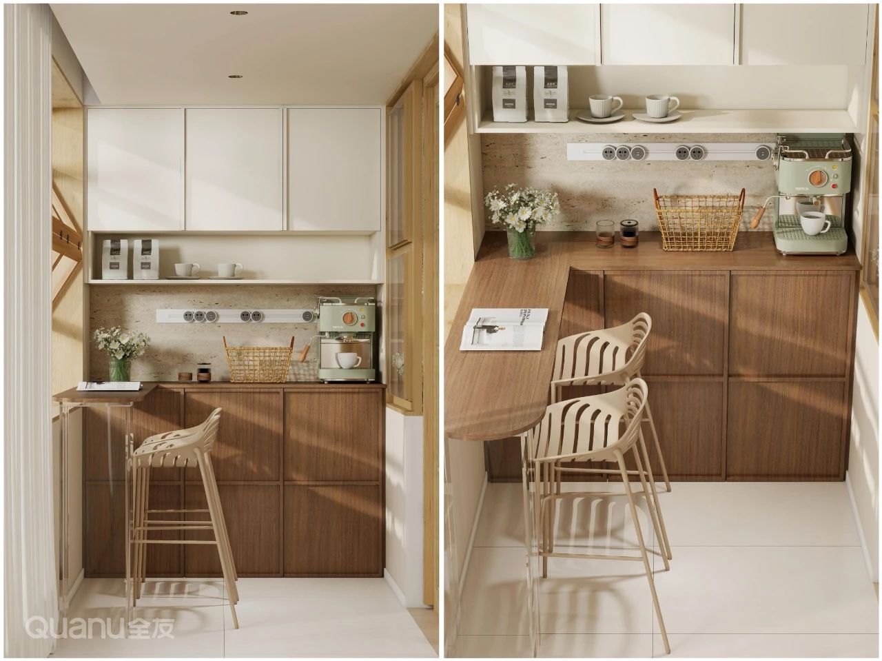 ②若陽(yáng)檯(tai)空間有(yǒu)限(xian),可(kě)面窗沿轉角打造(zao)陽(yáng)檯(tai)櫃+桌面一(yi)體(ti)化設(shè)計(ji),操作(zuò)檯(tai)放置咖啡機(jī)等(deng)小(xiǎo)型電(dian)器(qi),解鎖咖啡角+儲物(wù)雙重(zhong)功能(néng),既能(néng)在(zai)此晨間閱讀,也(ye)可(kě)悠享下午茶時光,輕松營(ying)造(zao)精(jīng)緻小(xiǎo)資(zi)氛圍~